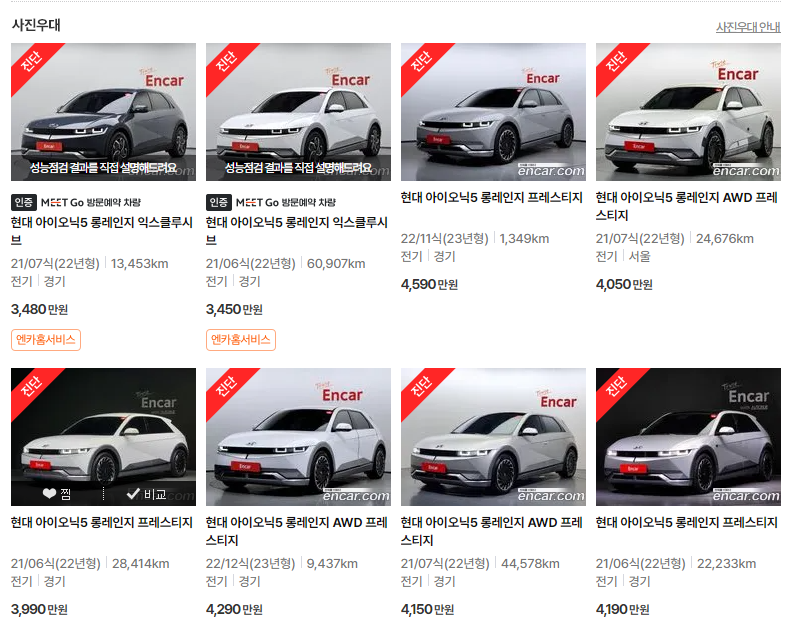 엔카에서 제공하는 아이오닉5의 실시간 중고 매물을 살펴보세요. 현재 가격대는 거의 신차와 비슷한 수준을 유지하고 있습니다. 신차 출고 대기 기간이 길어져 감가가 거의 없다고 보면 될 것 같습니다. 이러한 현상은 일시적인 것으로 보이며, 반도체 공급과 전기차 생산이 정상으로 회복되면 아이오닉5 중고차의 가격도 변화할 가능성 있습니다.